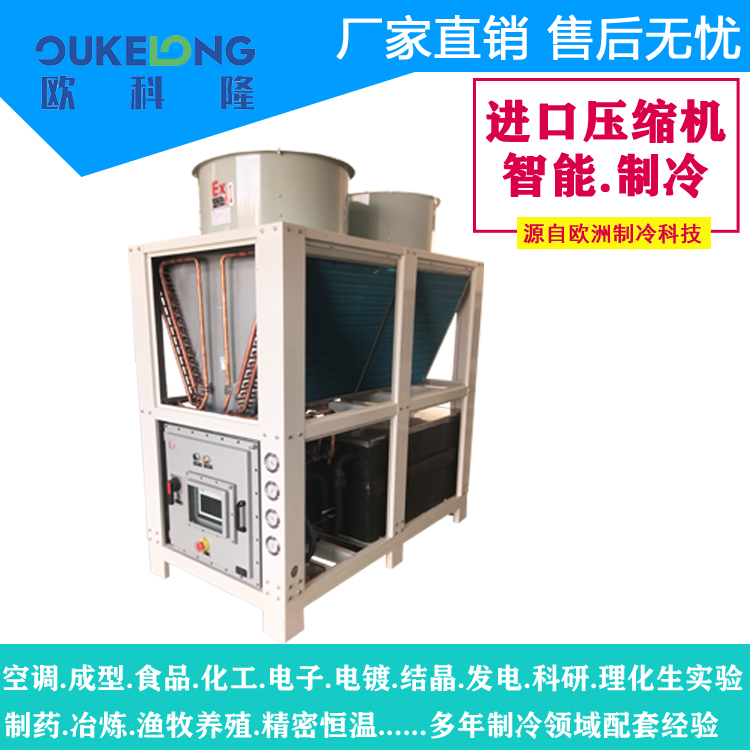 歐科隆20匹低溫防爆冷水機以安全、穩定、高效為核心,適用于各類防爆環境,并提供定制化服務,滿足不同工業需求。